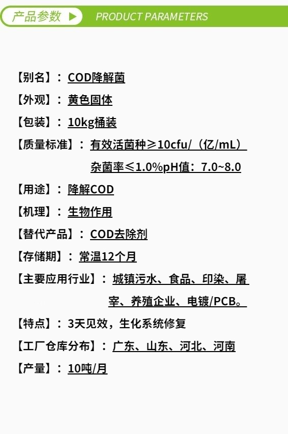 庫巴魯®COD激活菌301是針對生化系統(tǒng)中COD專門研發(fā)的高效COD去除菌,能降解廢水中的蛋白質(zhì)、淀粉、纖維素、糖類、油脂等碳?xì)浠衔铮嵘齼?yōu)勢菌群,有效抑制病原性微生物的繁殖。推薦閱讀:《滲濾液COD去除劑—清源牌》