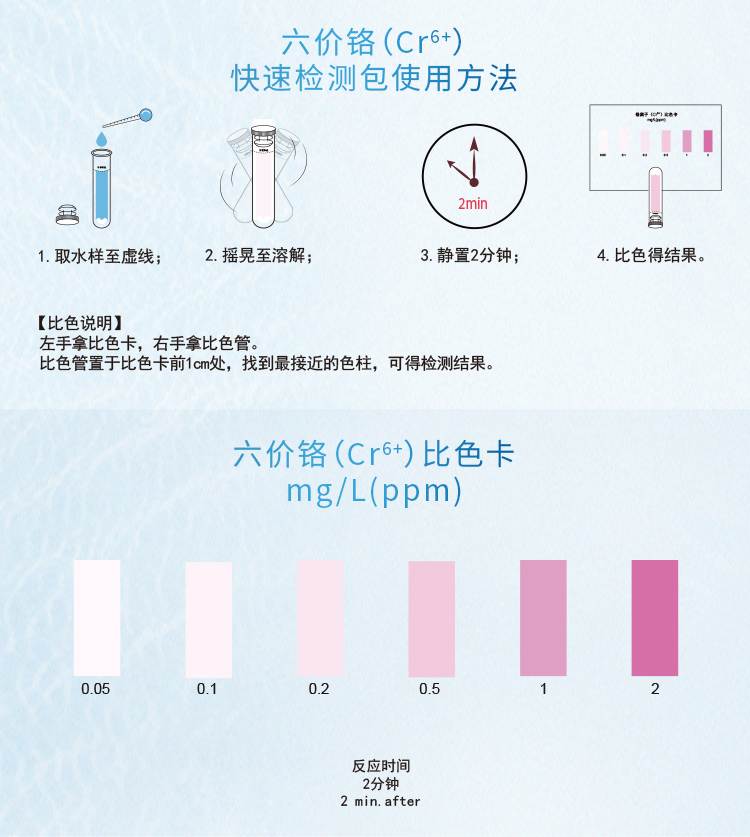 2.本產(chǎn)品檢測(cè)水中六價(jià)鉻(Cr)含量在0.05-2mg/L(ppm)范圍內(nèi),若要檢測(cè)2mg/L以上濃度水樣,請(qǐng)預(yù)先稀釋水樣后再進(jìn)行測(cè)定,具體操作見稀釋說明書。