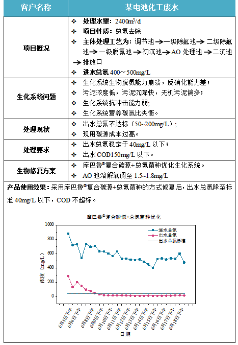 由于這類廢水水質(zhì)的特點(diǎn),廢水主要問題常常是C/N比例失常,氨氮、總氮濃度較高,以及存在一定的重金屬污染,廢水具有一定的可生化性,但可生化性通常不高(B/C低),因此投加碳源,并選用處理能力強(qiáng)的特效菌種來(lái)改善水的可生化性就顯得尤為關(guān)鍵。