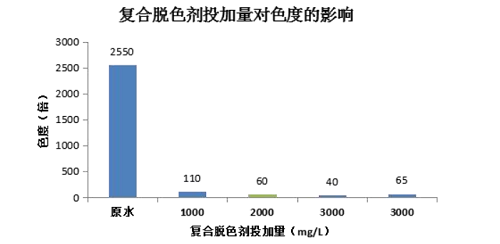 通過小試數(shù)據(jù),在 pH 值為 8 的情況下,最終選擇濃度為 2000mg/L 的復(fù)合脫色劑,可將色度降至 60,同比客戶現(xiàn)場(chǎng)的脫色劑+聚鋁投加量 3000mg/L,噸水藥劑投加量節(jié)省 0.7-1.1kg,可達(dá)到色度 100 的排放標(biāo)準(zhǔn)以下,脫色效果更佳。