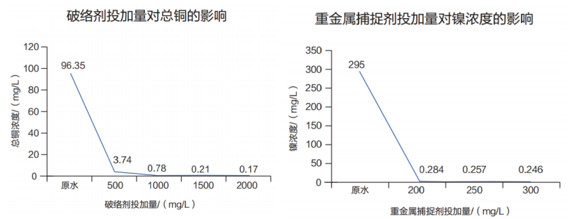 2.通過我司投加一系列配套藥劑后,達(dá)到如下效果在破絡(luò)劑投加量為1500mg/L,重金屬捕捉劑投加量為300mg/L時,出水總銅降至0.21mg/L、總鎳降至0.246mg/L、總磷穩(wěn)定在1.0mg/L、總氮穩(wěn)定在15mg/L;